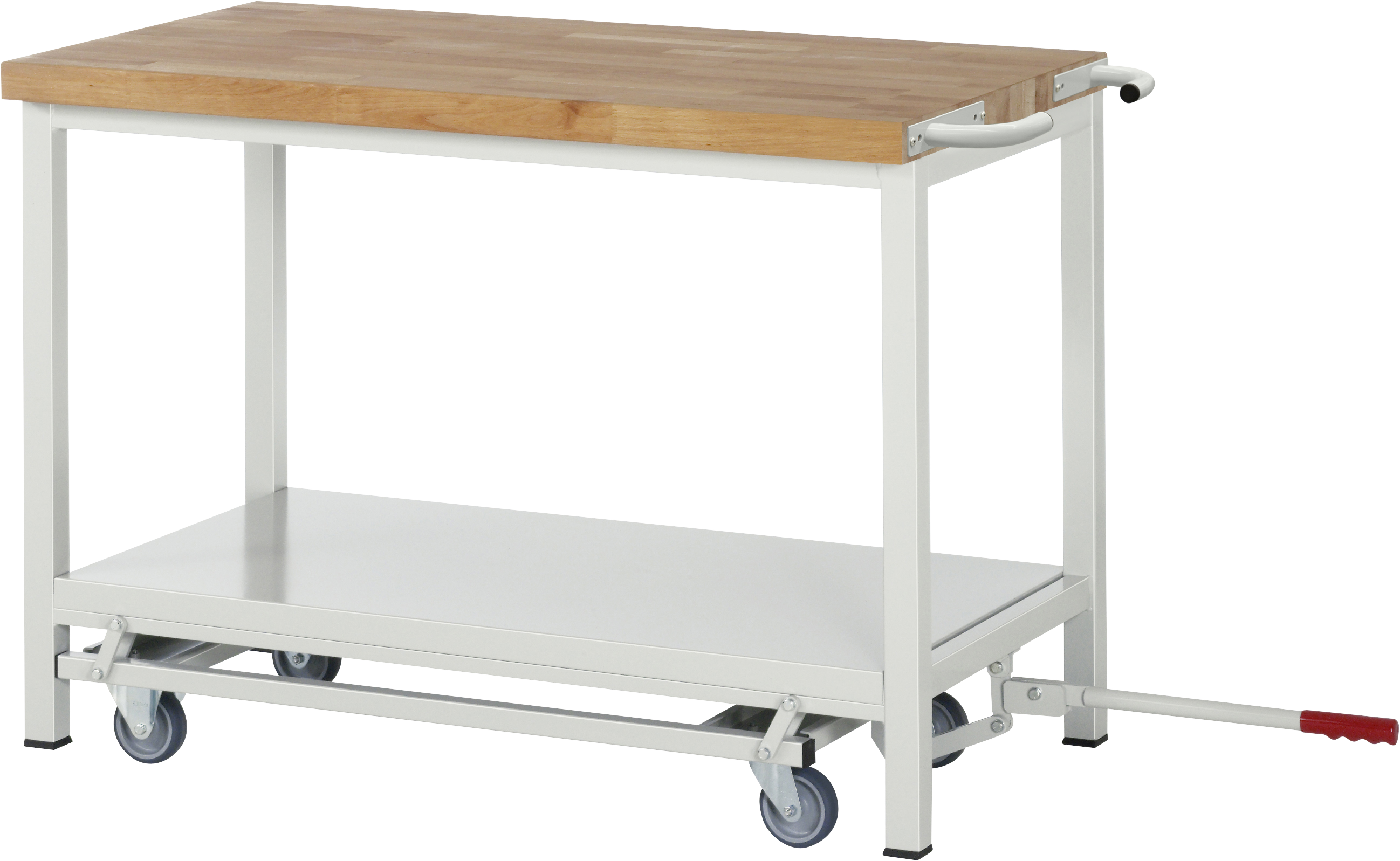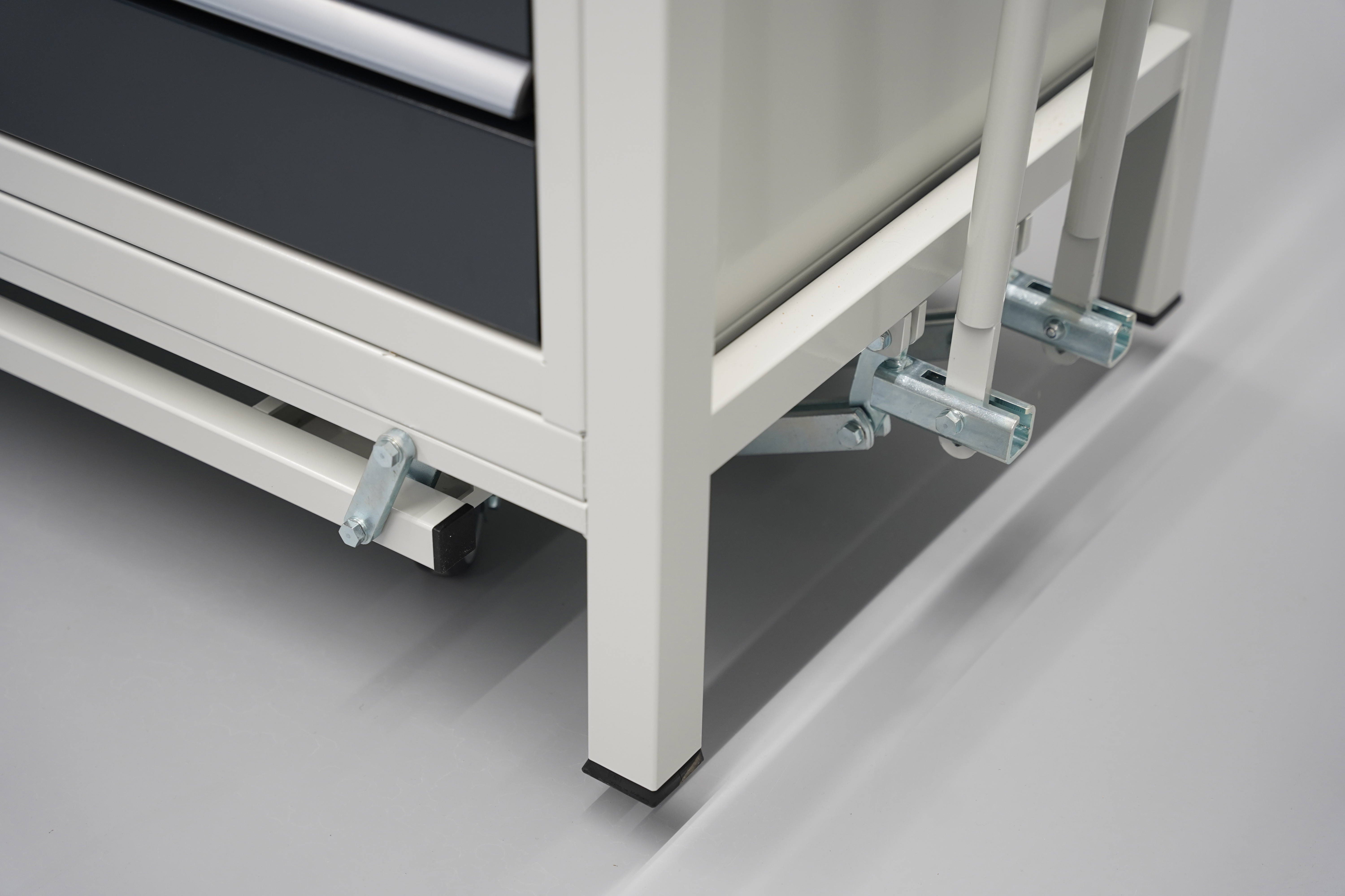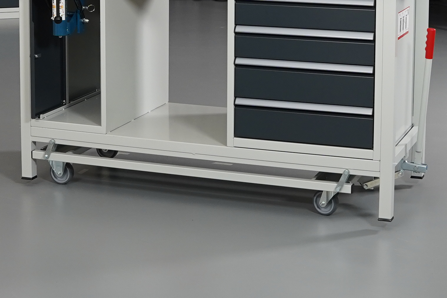 - 4-Fuß Schweißgestell mit zwei Gestellfußpaaren aus Profil-Stahlrohr (45x45x2 mm) inkl. Tiefenverstrebungen (oben und unten). Gestellfüße unten mit Abschlusselement inkl. Anti-Rutsch-Noppe für sicheren Stand. Untergebautes Fahrgestell mit Exzenterhebel (rechts). Bedienung des Exzenterhebels nur bis Zuladung von max. 300 kg möglich. Das Fahrgestell lässt sich mit dem Exzenterhebel ein- und ausfahren. Fahrgestell mit 2 Bock- und 2 Lenkrollen (Rollendurchmesser 100 mm, Bauhöhe 125 mm, Laufbelag aus thermoplastischem Gummi (spurlos, 85 ° Shore), Radkörper aus Polypropylen). Bockrollen sind an der linken Seite, Lenkrollen an der rechten Seite montiert (Radplattenbefestigung). Ablageboden unten (Tiefe 650 mm hinten bündig mit Systemunterbau, Fachhöhe 620 mm).