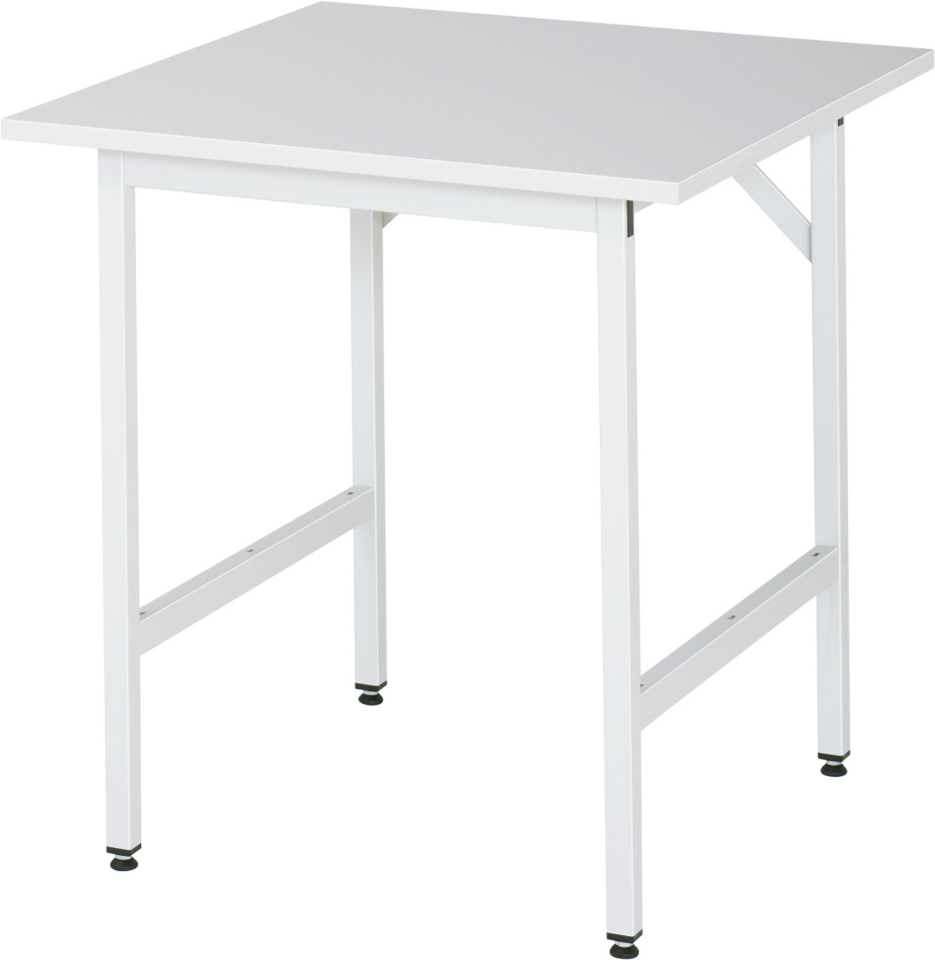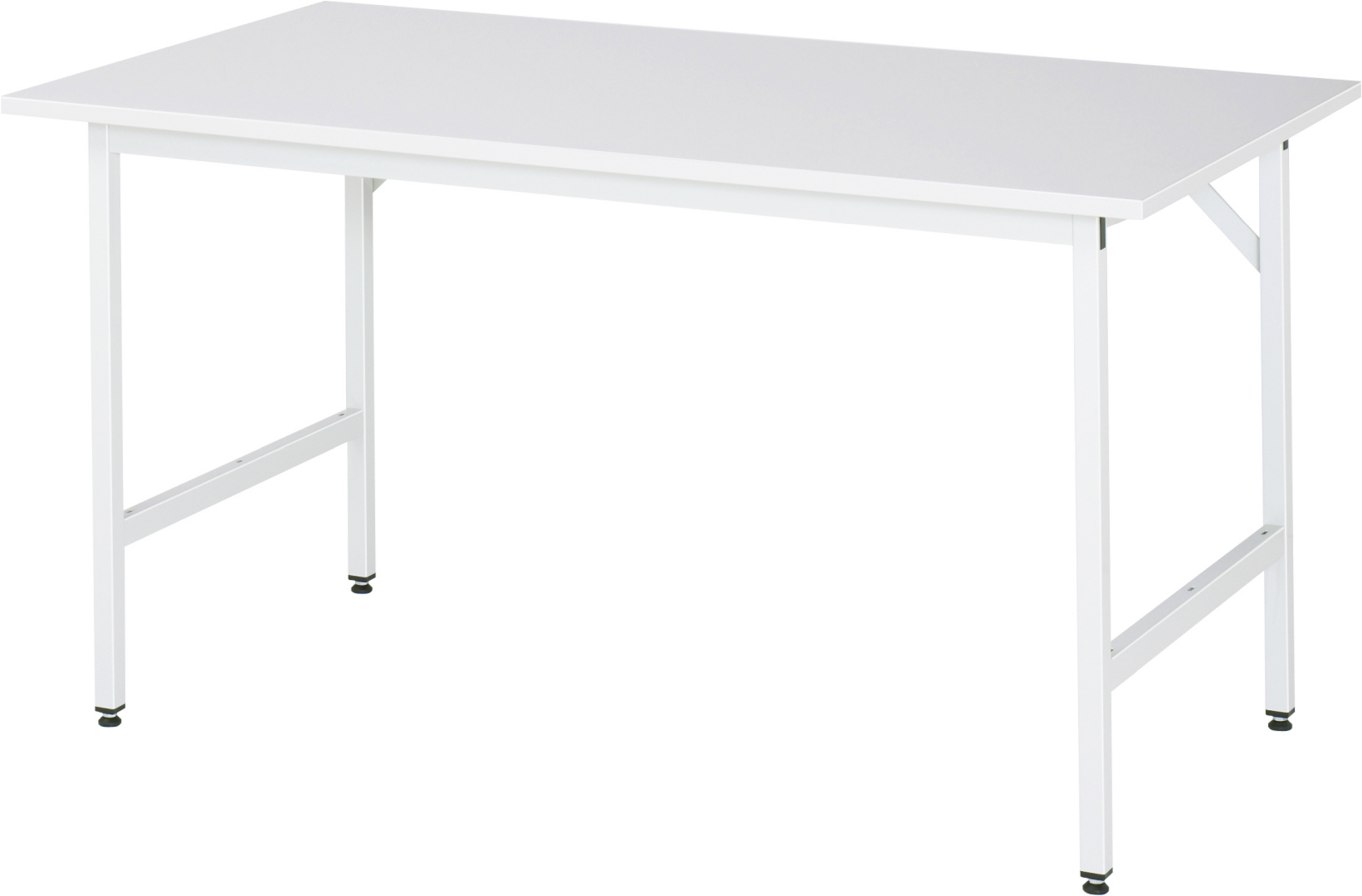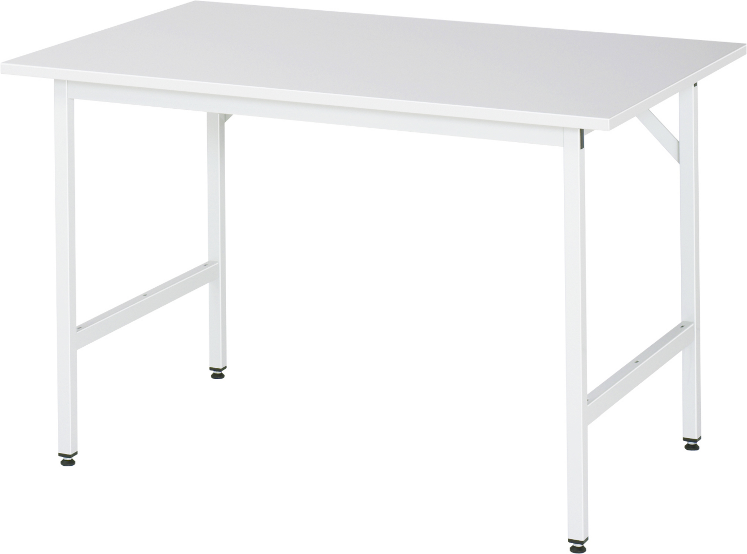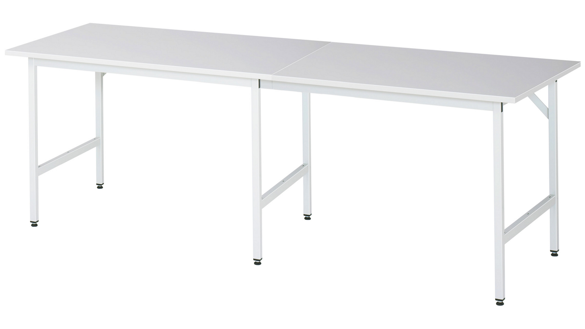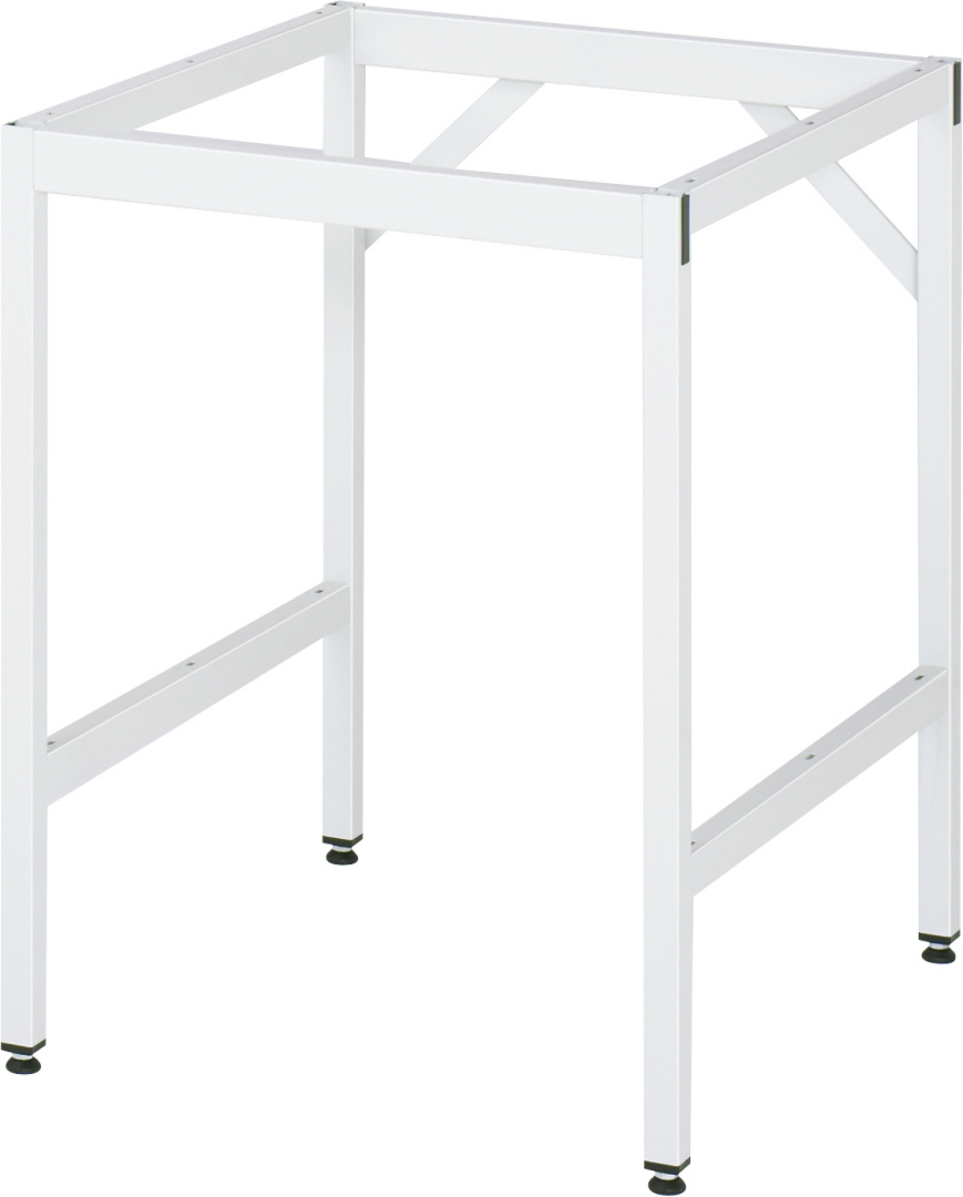 - 4-Fuß Gestell mit zwei Gestellfußpaaren aus Profil-Stahlrohr (60x30x2 mm) inkl. Tiefenverstrebungen (oben und unten). Gestellfüße unten mit Abschlusselement inkl. Höheneinstellung. Querstreben aus Profil-Stahlrohr (50x25x2 mm) oben unter der Arbeitsplatte (vorne und hinten). Aussteifungstraversen hinten (links und rechts) als Verbindung zwischen Gestellfußpaar und hinterer Querstrebe. Die Gestellfüße sind vorbereitet für die Aufnahme/Nachrüstung eines Rollensatzes.