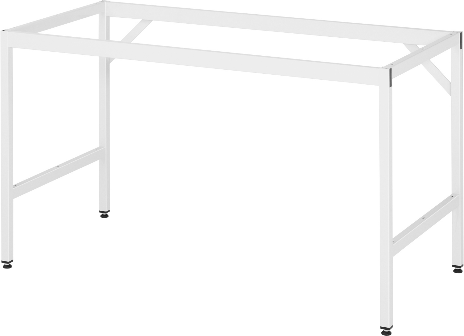 - 4-Fuß Gestell mit zwei Gestellfußpaaren aus Profil-Stahlrohr (30x30x2 mm) inkl. Tiefenverstrebungen (oben und unten). Gestellfüße unten mit Abschlusselement inkl. Höheneinstellung. Querstreben aus Profil-Stahlrohr (50x25x2 mm) oben unter der Arbeitsplatte (vorne und hinten). Aussteifungstraversen hinten (links und rechts) als Verbindung zwischen Gestellfußpaar und hinterer Querstrebe. Die Gestellfüße sind vorbereitet für die Aufnahme/Nachrüstung eines Rollensatzes.