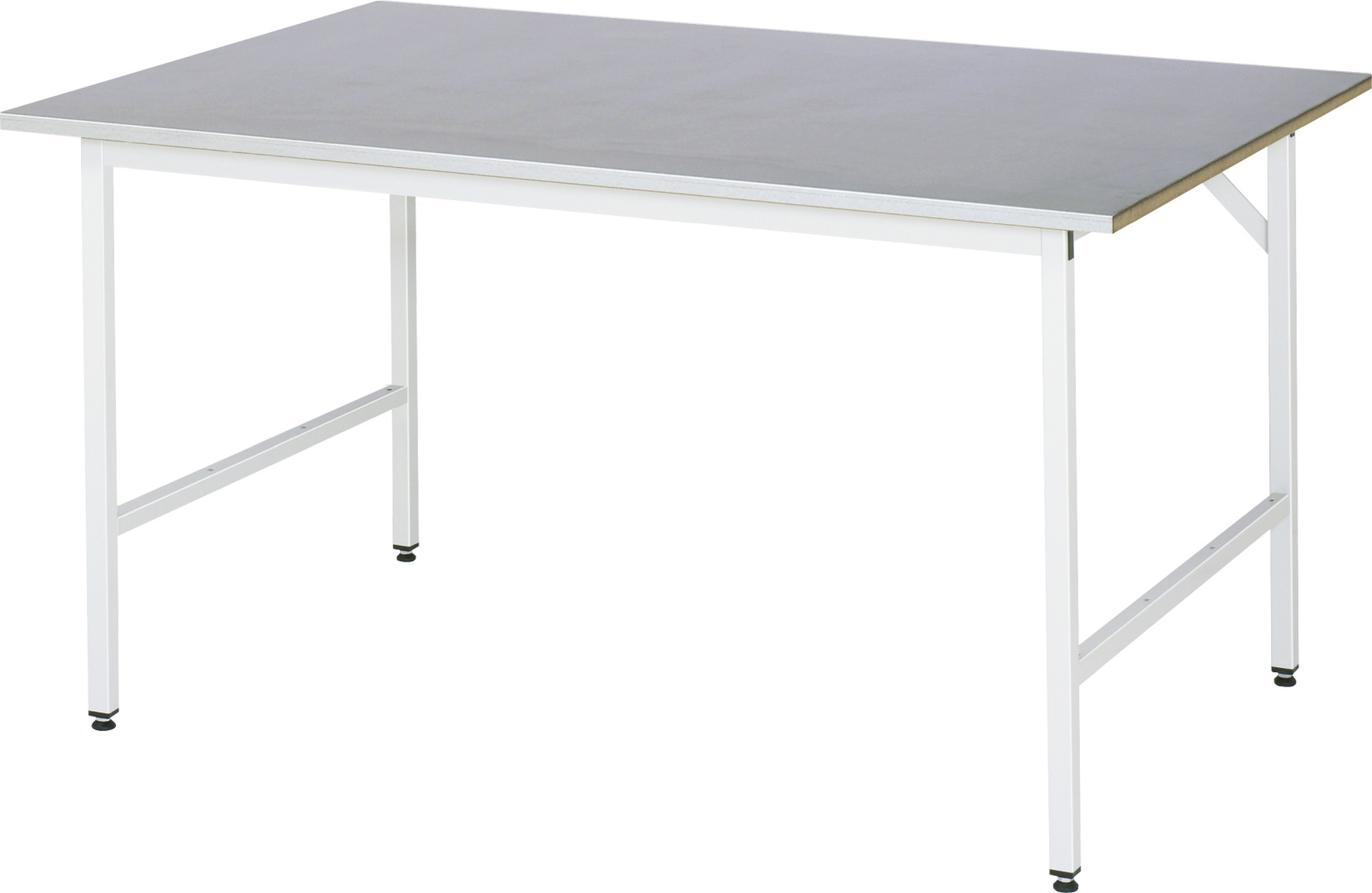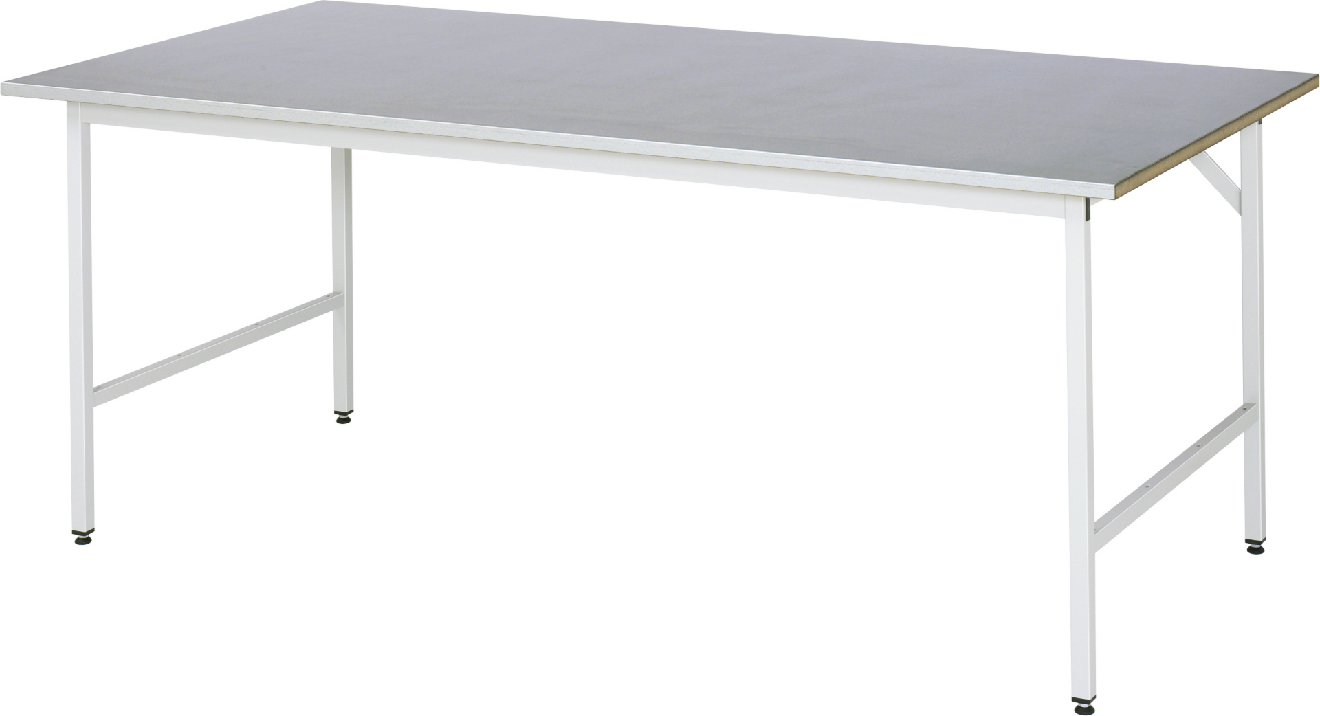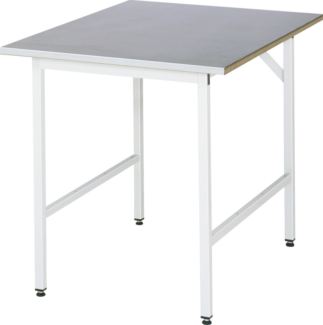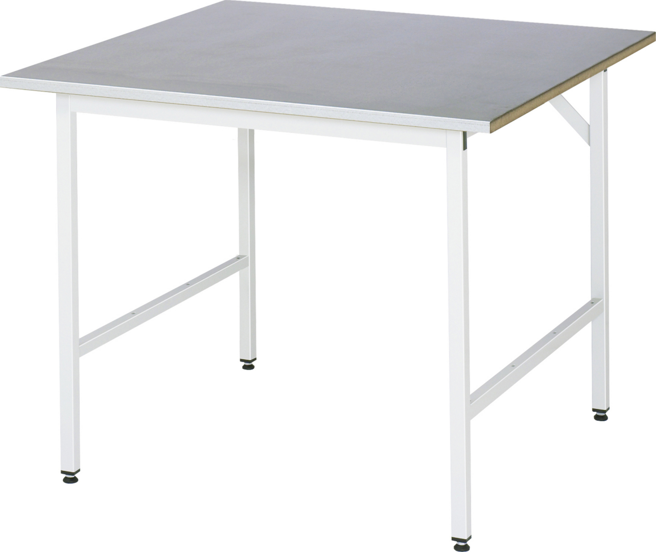 - 4-Fuß Gestell mit zwei Gestellfußpaaren aus Profil-Stahlrohr (30x30x2 mm) inkl. Tiefenverstrebungen (oben und unten). Gestellfüße unten mit Abschlusselement inkl. Höheneinstellung. Querstreben aus Profil-Stahlrohr (50x25x2 mm) oben unter der Arbeitsplatte (vorne und hinten). Aussteifungstraversen hinten (links und rechts) als Verbindung zwischen Gestellfußpaar und hinterer Querstrebe. Die Gestellfüße sind vorbereitet für die Aufnahme/Nachrüstung eines Rollensatzes.