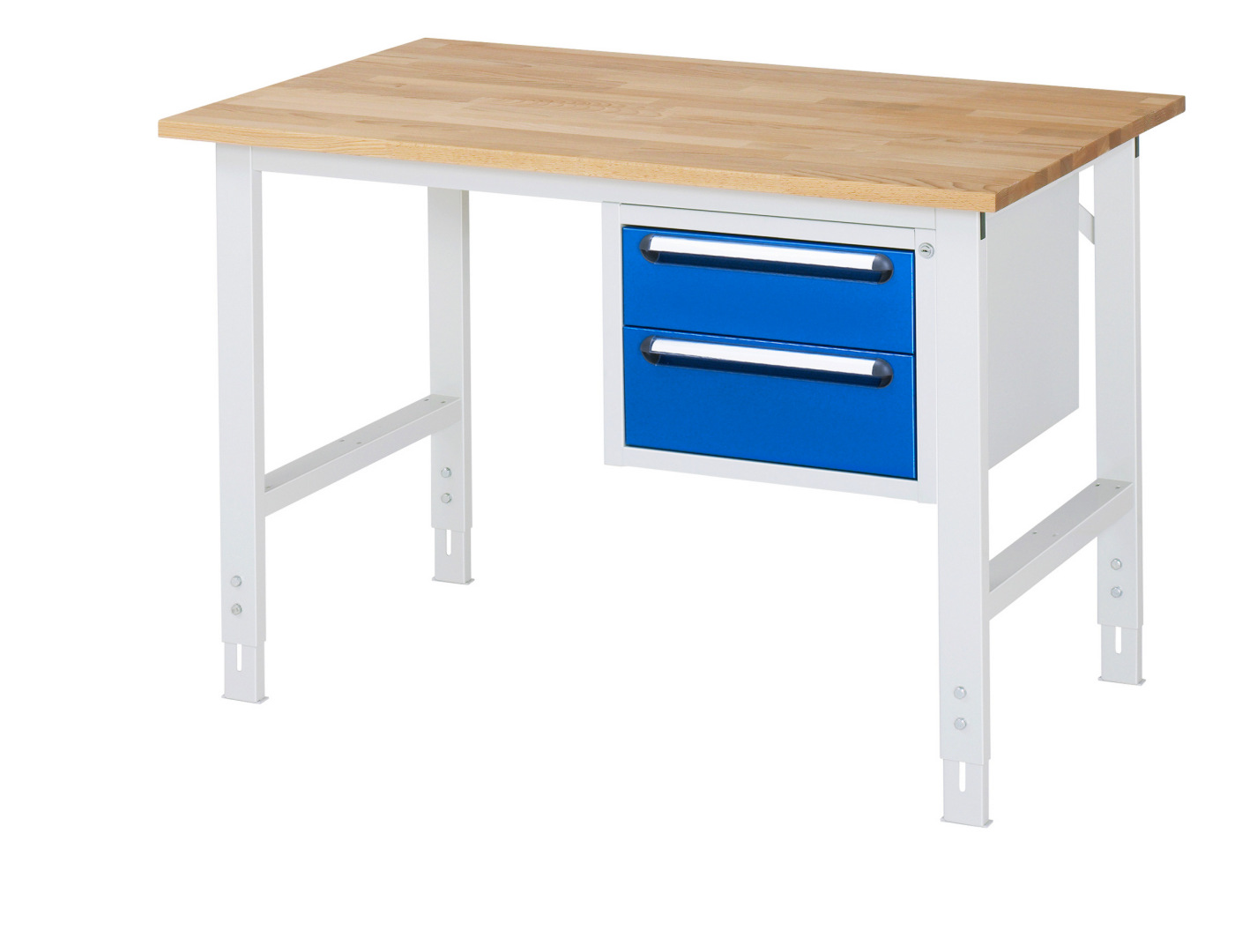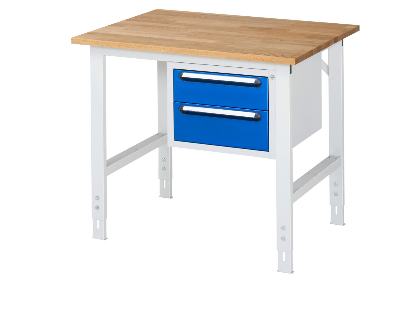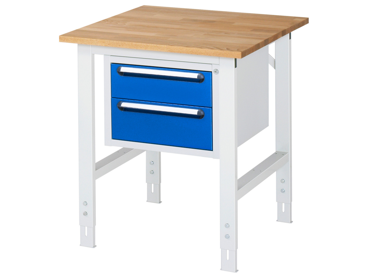 - 4-Fuß Gestell mit zwei Gestellfußpaaren aus Profil-Stahlrohr (60x30x2 mm) inkl. Tiefenverstrebungen (oben und unten). Gestellfüße unten mit Abschlusselement inkl. Höheneinstellung. Querstreben aus Profil-Stahlrohr (50x25x2 mm) oben unter der Arbeitsplatte (vorne und hinten). Aussteifungstraversen hinten (links, mittig und rechts) als Verbindung zwischen Gestellfußpaar und hinterer Querstrebe. Die Gestellfüße sind vorbereitet für die Aufnahme/Nachrüstung eines Rollensatzes.