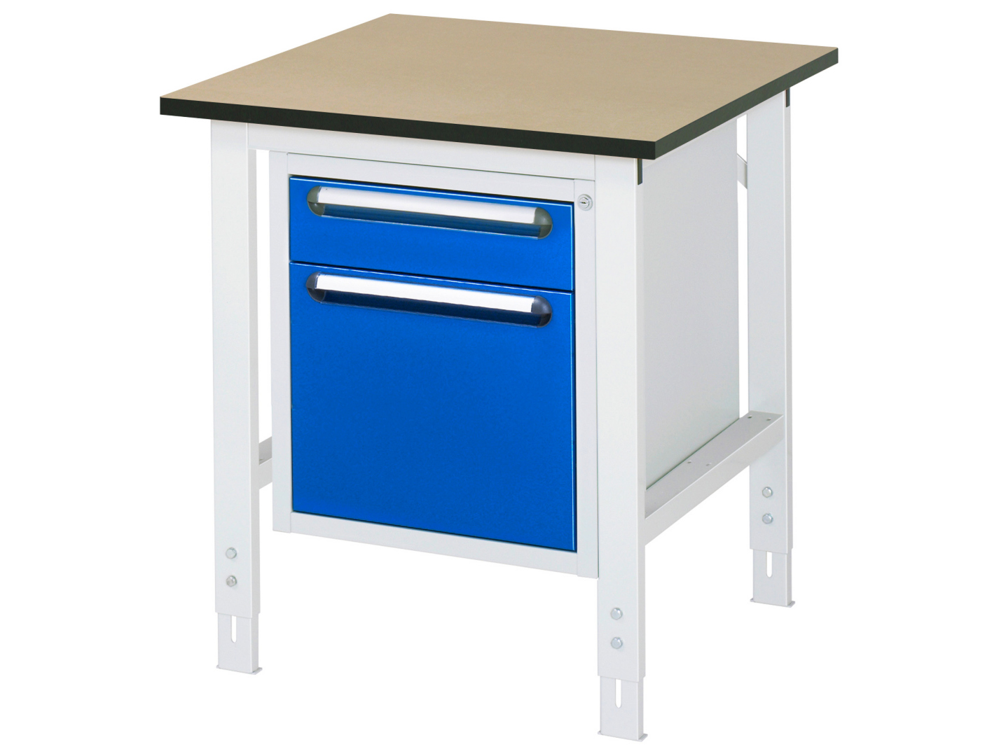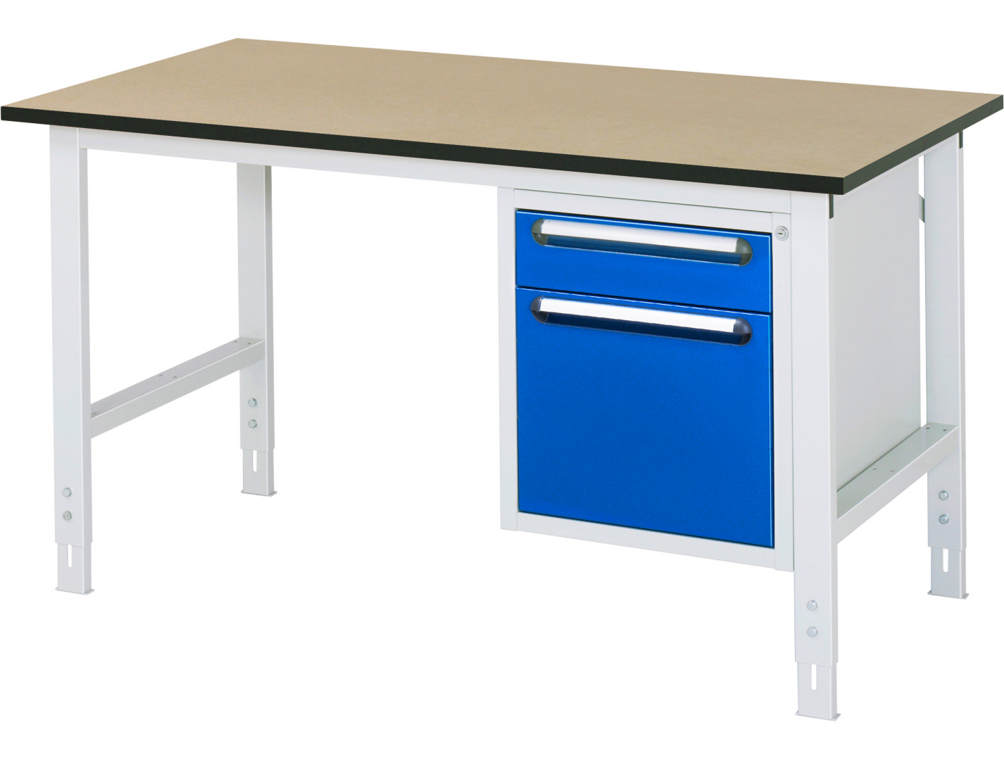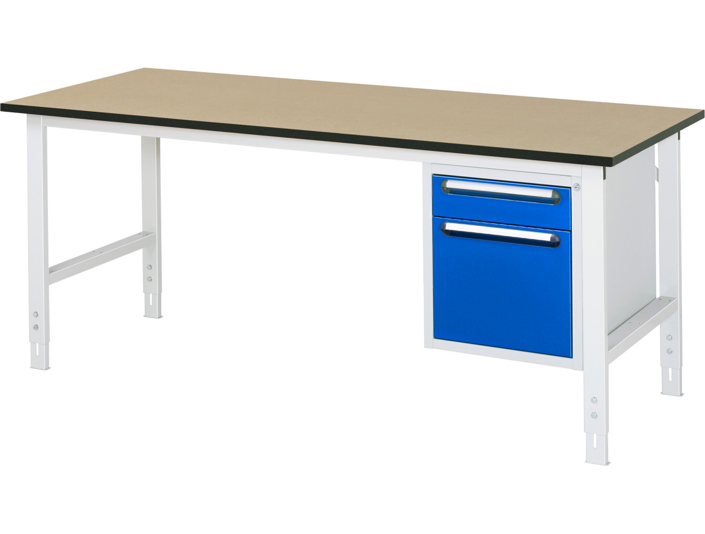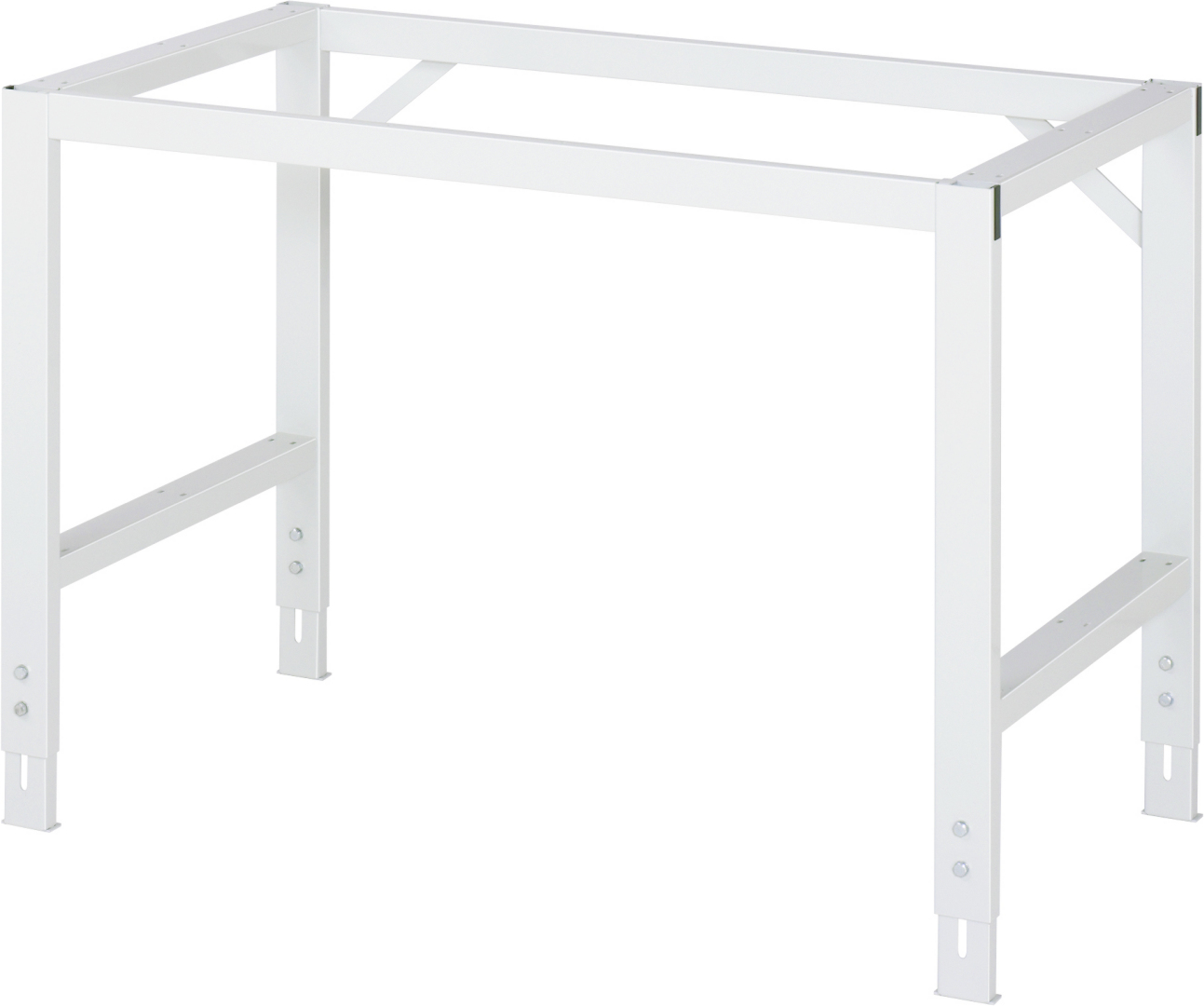 - 4-Fuß Gestell mit zwei Gestellfußpaaren aus Profil-Stahlrohr (60x30x2 mm) inkl. Tiefenverstrebungen (oben und unten). Gestellfüße unten mit Abschlusselement inkl. Höheneinstellung. Querstreben aus Profil-Stahlrohr (50x25x2 mm) oben unter der Arbeitsplatte (vorne und hinten). Aussteifungstraversen hinten (links, mittig und rechts) als Verbindung zwischen Gestellfußpaar und hinterer Querstrebe. Die Gestellfüße sind vorbereitet für die Aufnahme/Nachrüstung eines Rollensatzes.