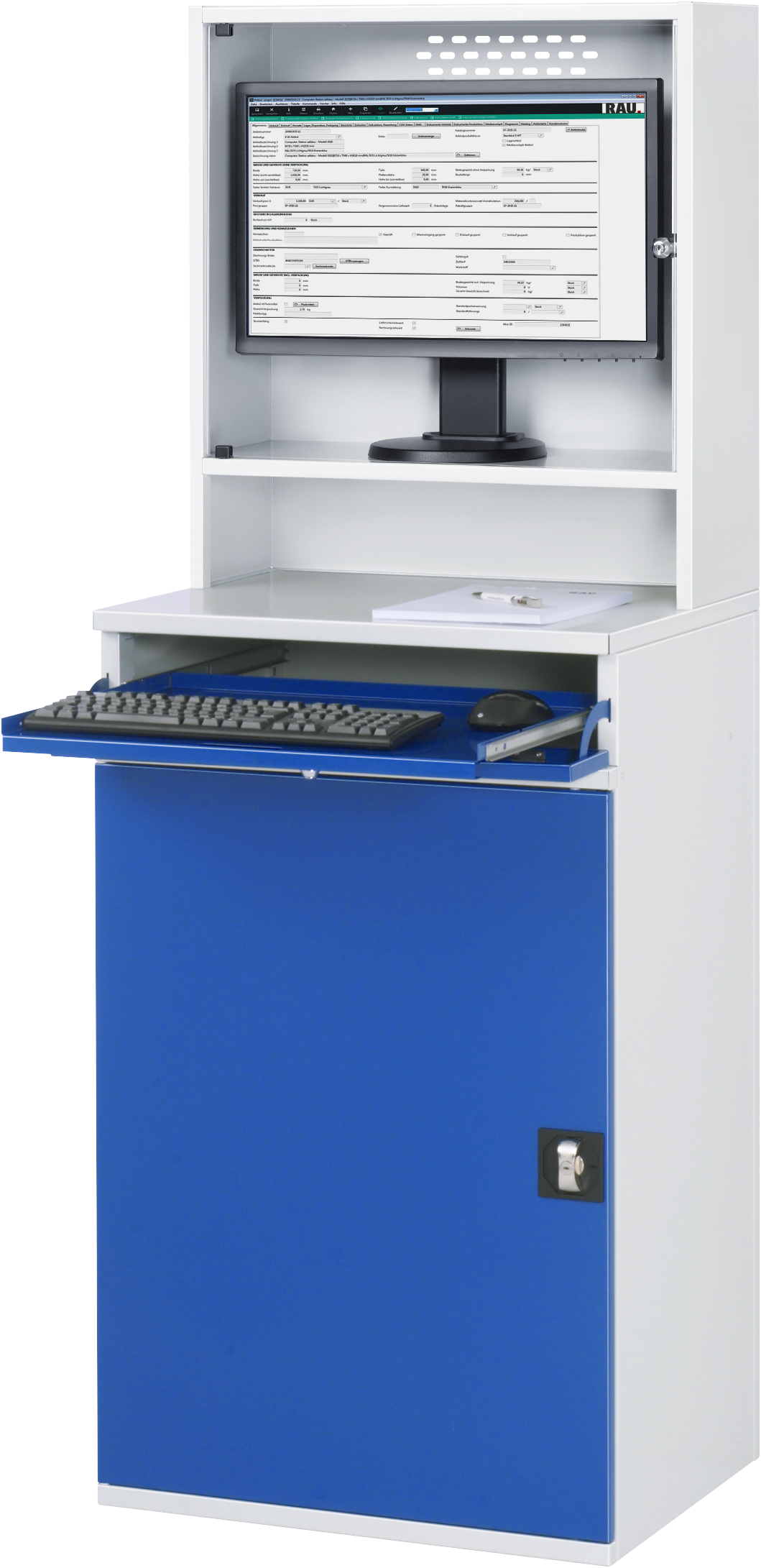 - Tastaturfach(Höhe 120 mm) mit Frontklappe (abschließbar) und Tastaturauszug. Tastaturauszug B570 x T450 mm zur Tastatur- und Mausauflage (Auszug 80 %, Tragkraft 20 kg, Rastpunkt).