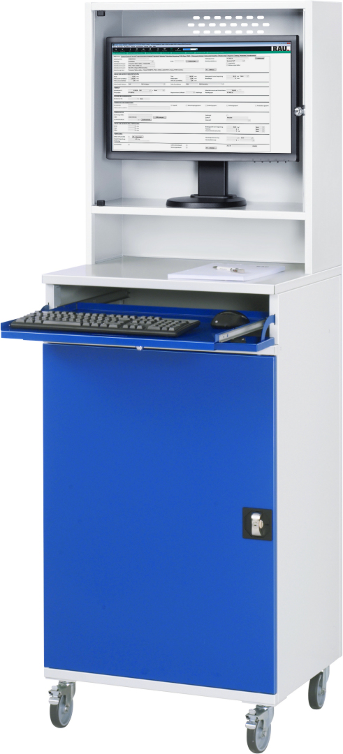 Computer-Schrank - Modell 99 – Geeignet für den stationären Einsatz als vollständiger Computer-Arbeitsplatz mit integrierter Monitor- und Tastaturunterbringung in Produktions-, Fertigungs- und Montagebetrieben. Produziert in Balingen-Frommern – Made in Germany.
