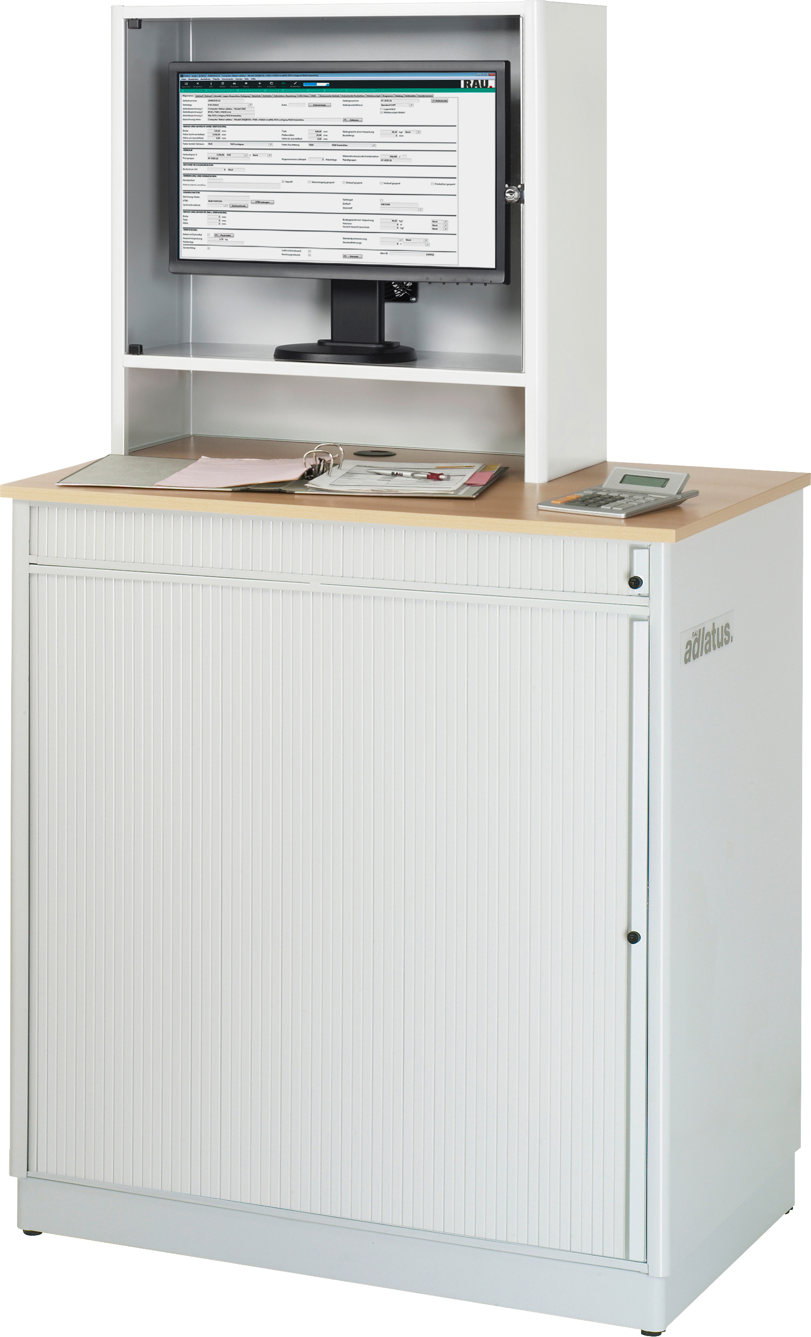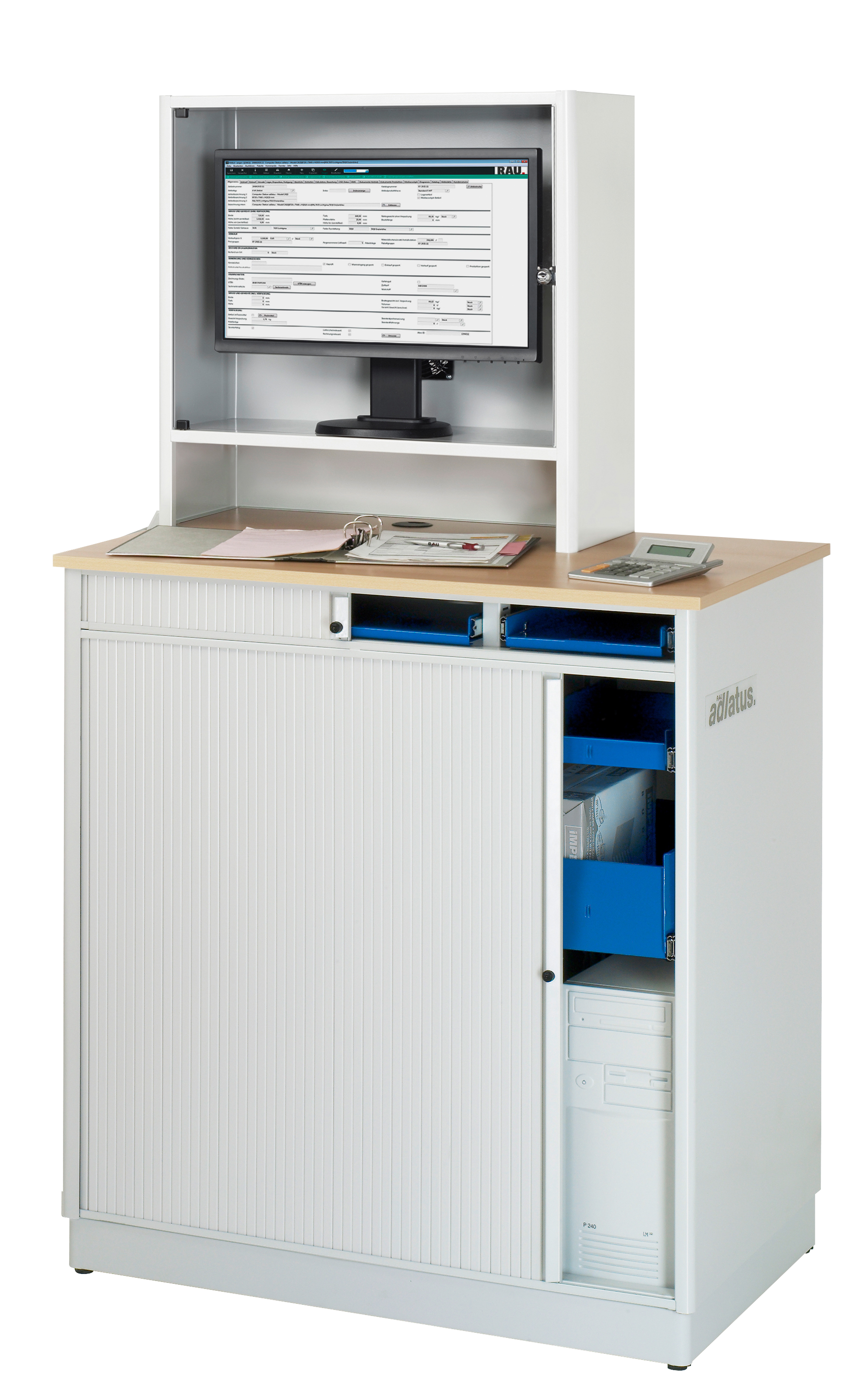 - Basisschrank geteilt in separat nutz- und bedienbares Tastatur- und Hardwarefach. Beide Fächer sind durch einen separaten, vertikal geführten Rollladen verschließbar (Öffnung nach links). Kabeleinlass an der Schrankrückseite sowie Kabeldurchlässe im Boden sowie Innenteil. Schranksockel (H 80 mm) inkl. Verstellgleiter.