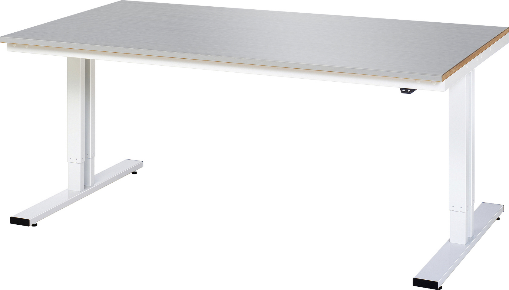 - 2 Doppelhubsäulen (80x50 mm, Prüfung gem. EN 60335-1) inkl. Steuereinheit und Anschlusskabel mit Stecker. Kufen aus Profil-Stahlrohr (100x30x3 mm) inkl. Nivellierfüßen. Kompletter Rahmen aus Profil-Stahlrohr (Stahlrohr 50x25x2,5 mm) oben unter der Arbeitsplatte. Bedienelement mit Auf-/Ab-Taster.
