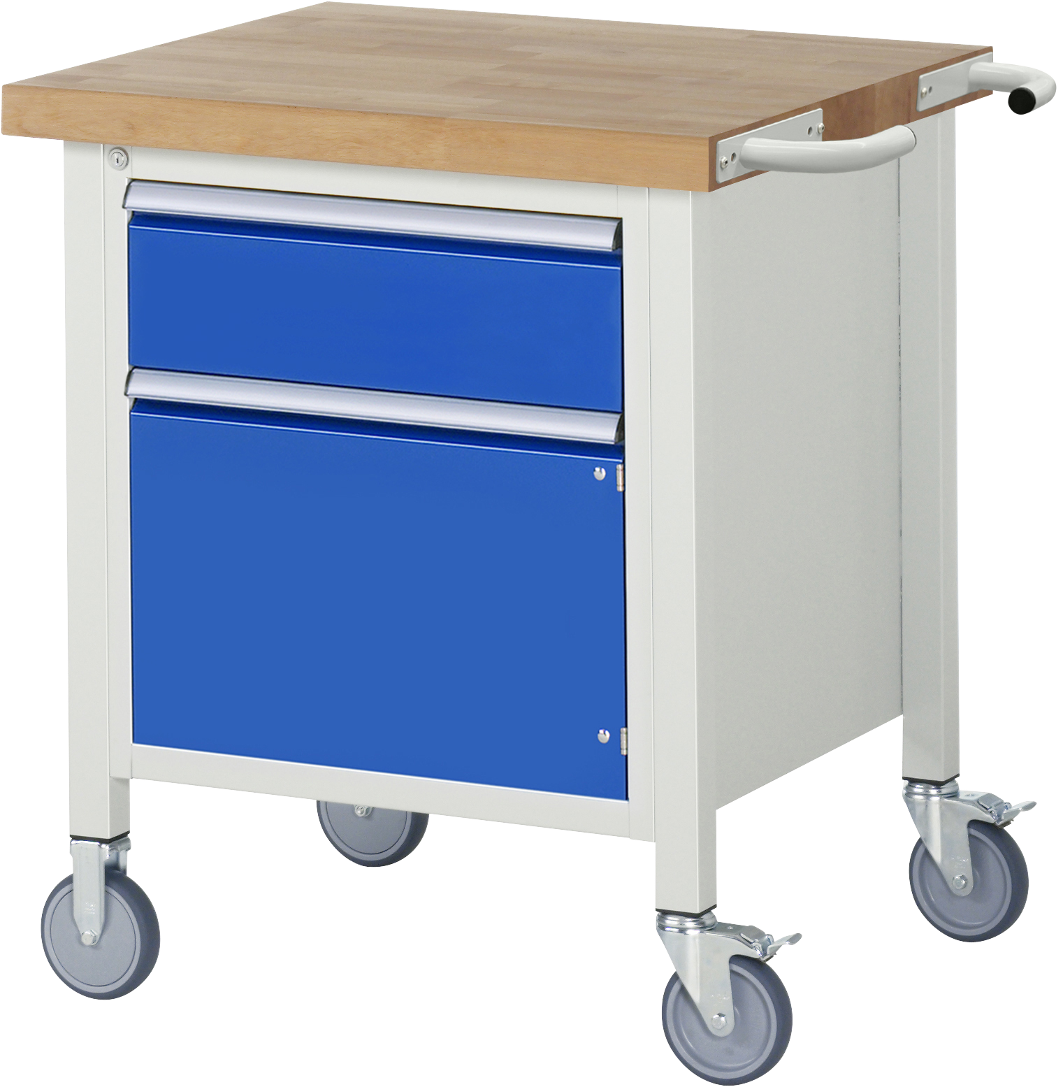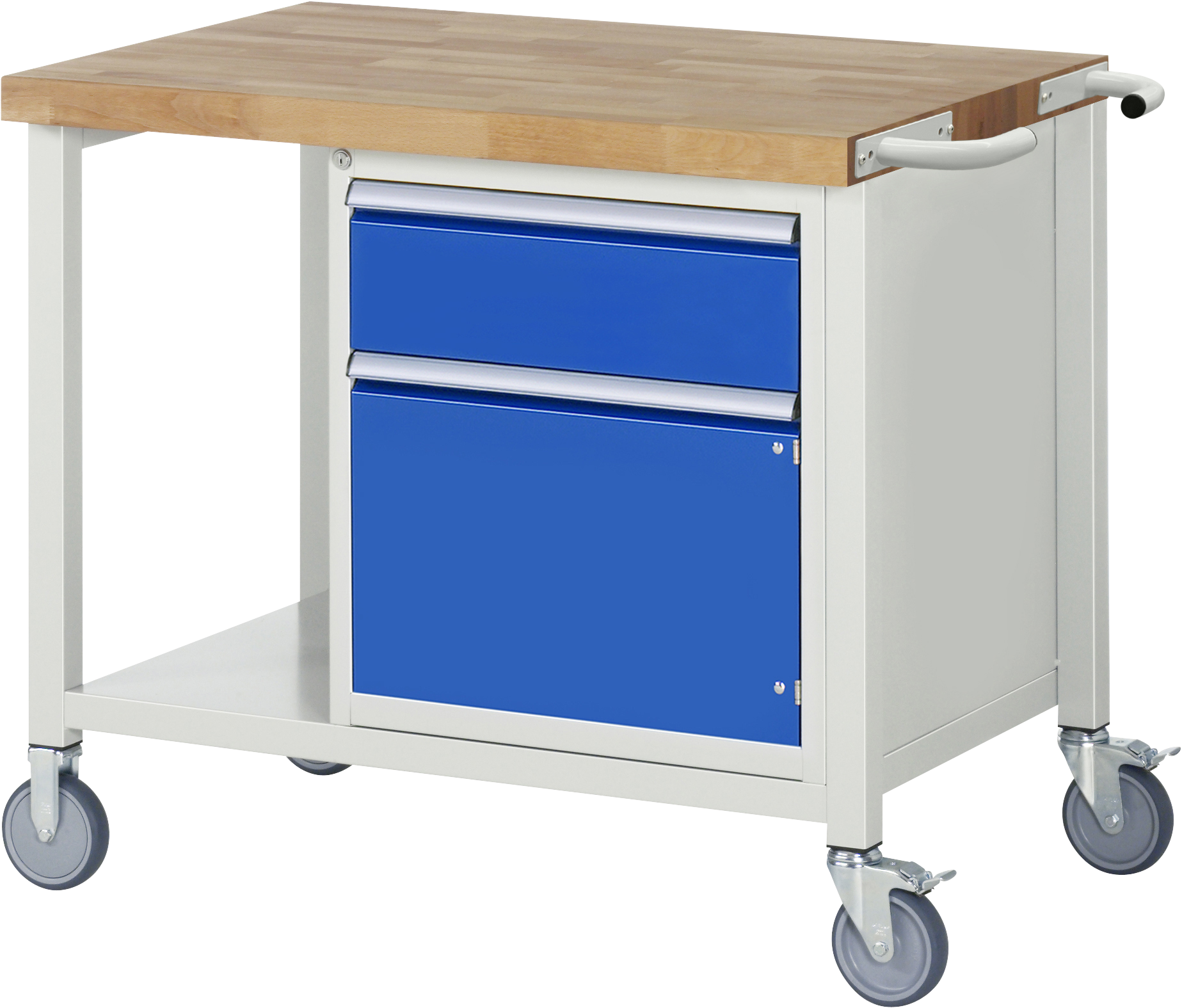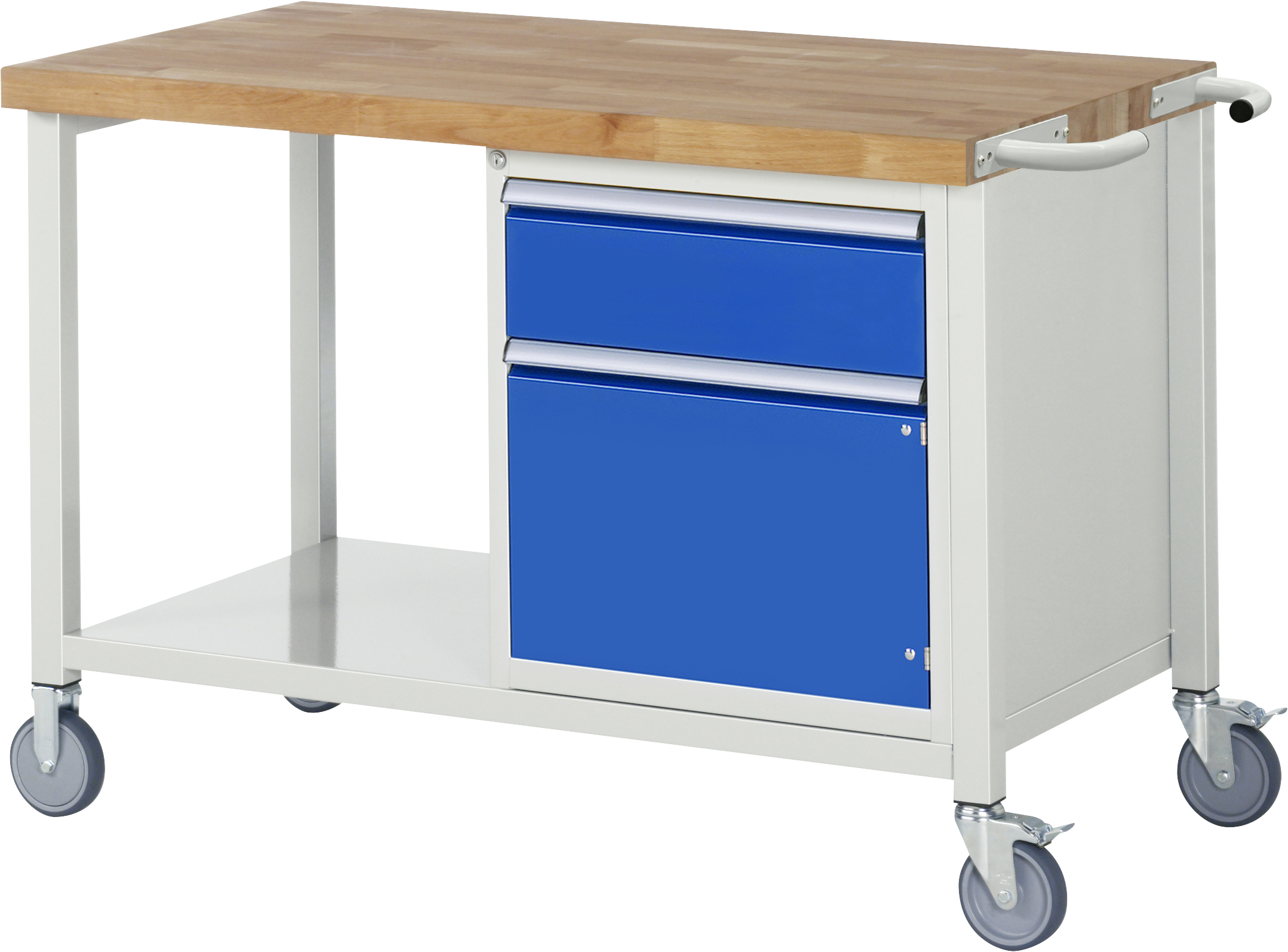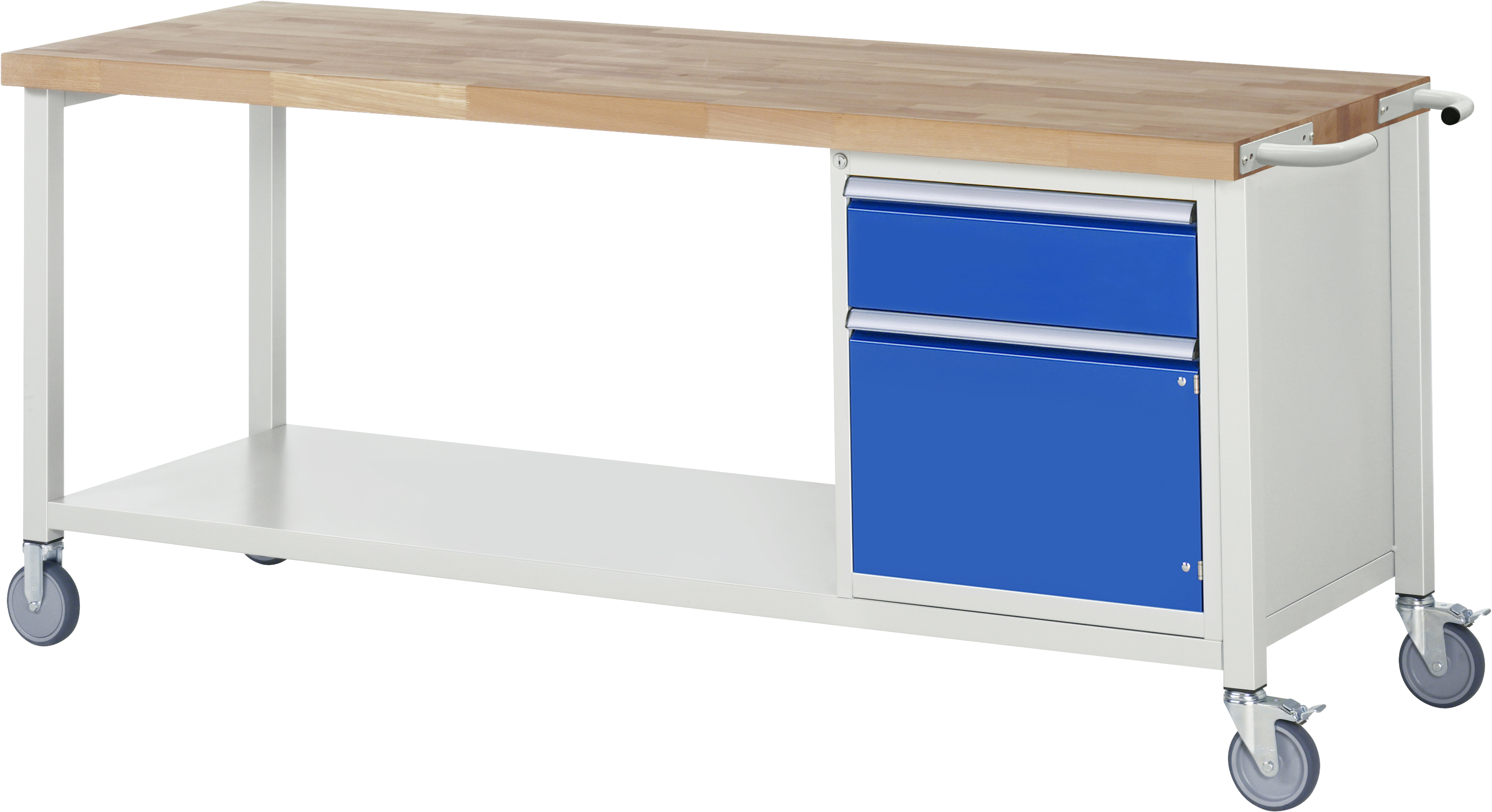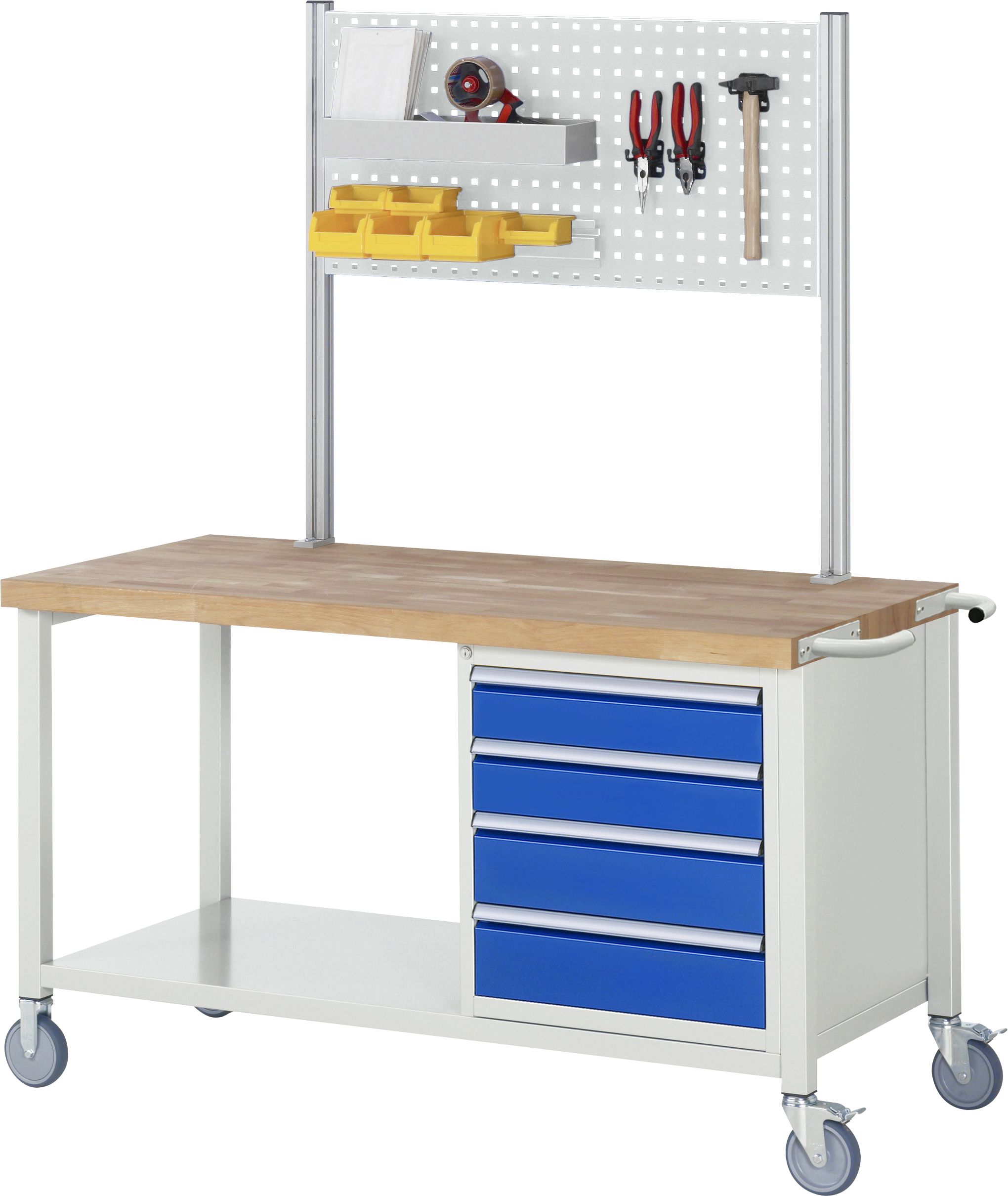 - 4-Fuß Schweißgestell mit zwei Gestellfußpaaren aus Profil-Stahlrohr (45x45x2 mm) inkl. Tiefenverstrebungen (oben und unten). Gestellfüße mit 2 Bock- und 2 Lenkrollen mit Feststeller (Rollendurchmesser 125 mm, Bauhöhe 150 mm, Laufbelag aus thermoplastischem Gummi (grau, spurlos, 85° Shore), Radkörper aus Polypropylen). Bockrollen sind an der linken Seite, Lenkrollen mit Feststeller an der rechten Seite montiert (Expanderbefestigung). Ablageboden unten (Tiefe 650 mm hinten bündig mit Systemunterbau, Fachhöhe 620 mm).