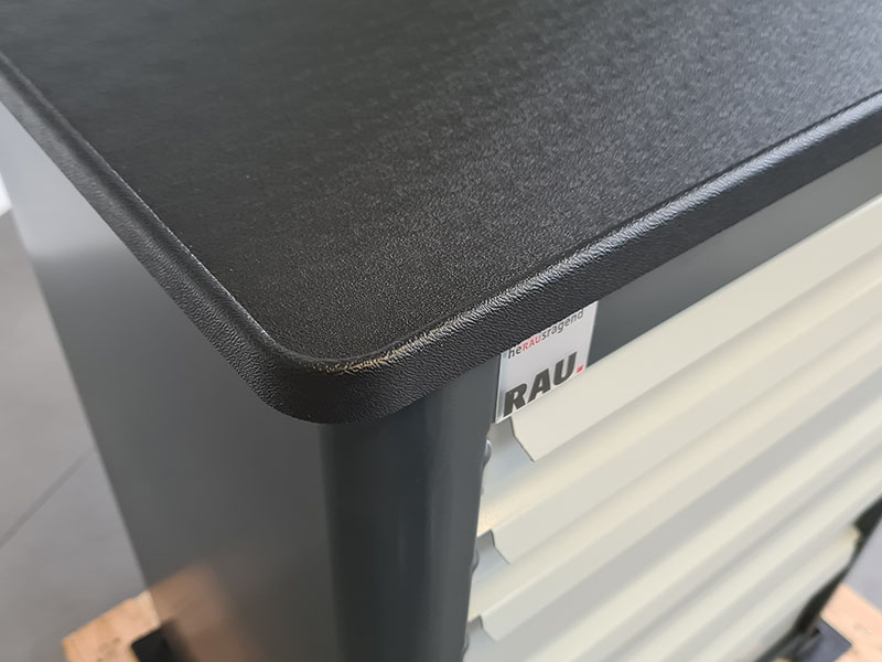 - Werkbank oben mit Metallträger inkl. ABS-Verbundplatte mit 4-seitigem Abrollrand, Höhe 25 mm.