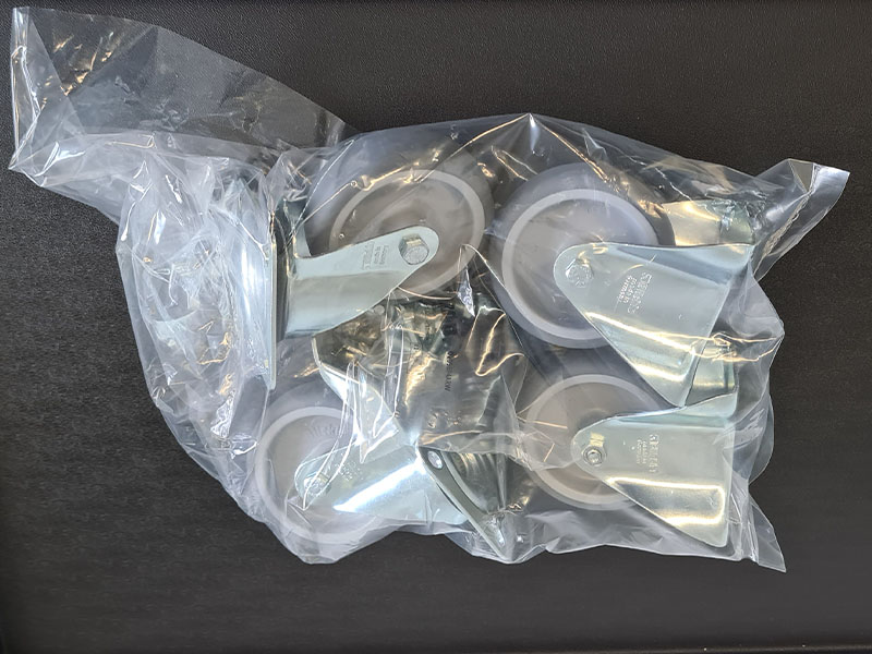 - Rollensatz mit 2 Bock- und 2 Lenkrollen, davon 1 mit Feststeller (Rollendurchmesser 100 mm, Bauhöhe 120 mm, Laufbelag aus thermoplastischem Gummi (grau, spurlos, 85° Shore), Radkörper aus Polypropylen). Befestigung mit Radplattenaufnahme (lose beiliegend).