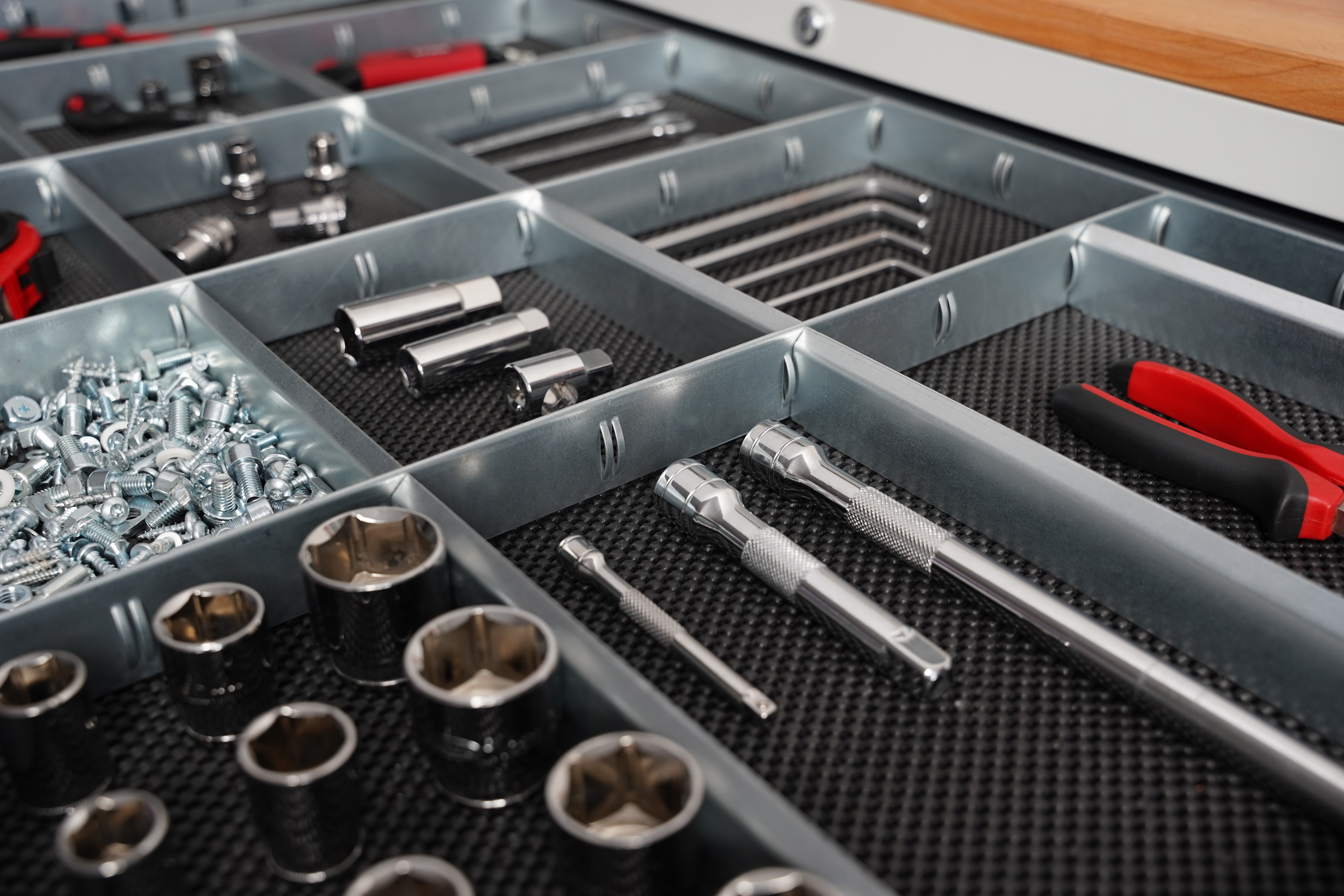 - 1 x Rasterleisten-Basis-Set (4-teilig) zum Einsetzen in die Schublade, enthält Prägungen zur Aufnahme der Trennwände und Trennbleche.