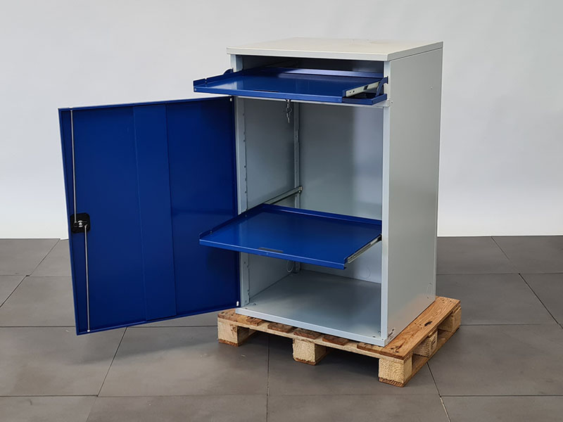 - Basisschrank geteilt in separat nutz- und bedienbares Tastatur- und Flügeltürfach. Kabeldurchlässe an der Schrankrückseite, im Deckel sowie im Innenteil.