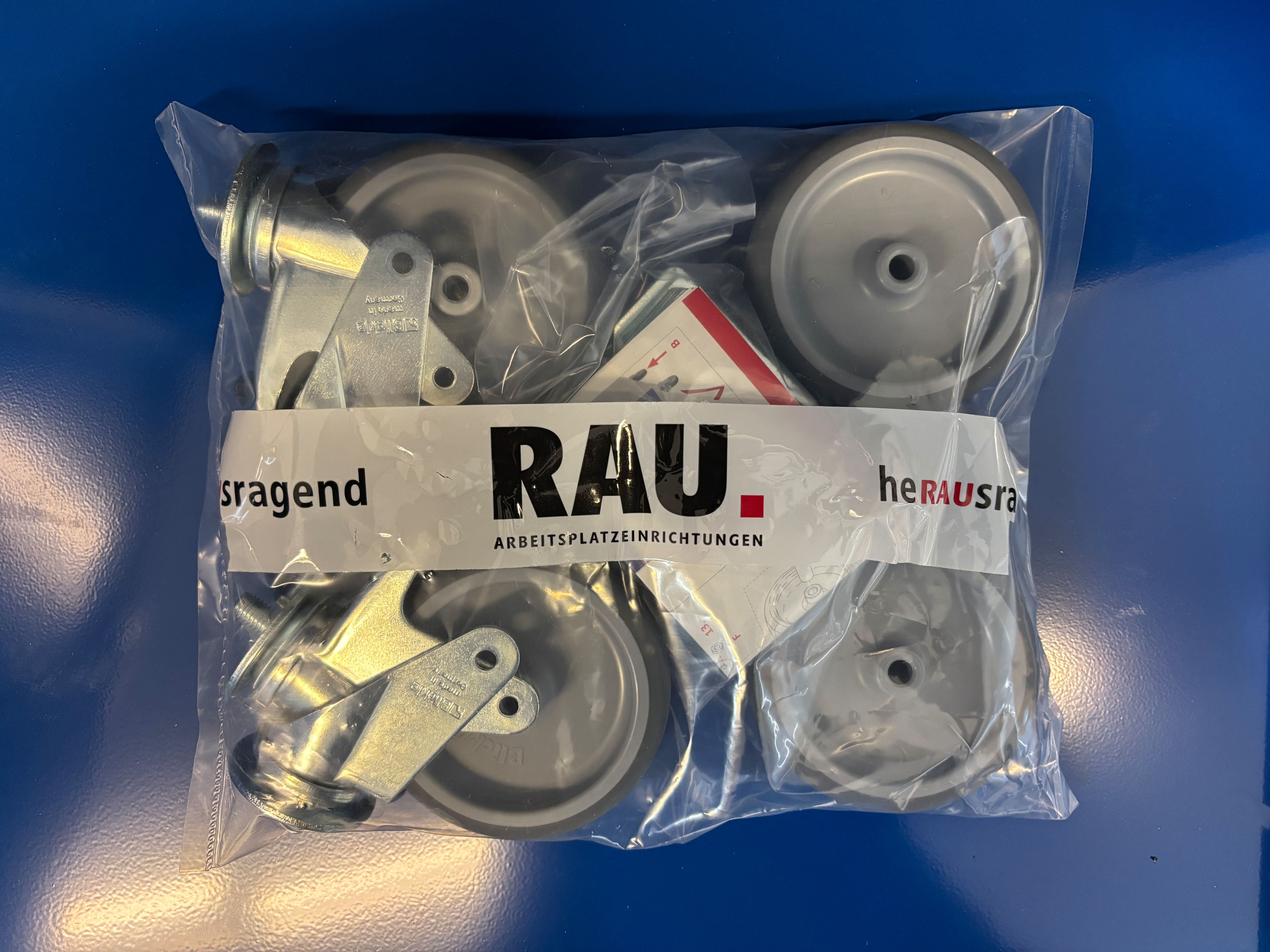 - Basisschrank geteilt in separat nutz- und bedienbares Tastatur- und Flügeltürfach, inkl. Rollensatz. Rollensatz mit 4 Lenkrollen, davon 2 mit Feststeller (Rollendurchmesser 100 mm, Bauhöhe 120 mm, Laufbelag aus thermoplastischem Gummi (grau, spurlos, 85° Shore), Radkörper aus Polypropylen). Befestigung mit Dreieck-Gewindeplatten. Kabeldurchlässe an der Schrankrückseite, im Deckel sowie im Innenteil