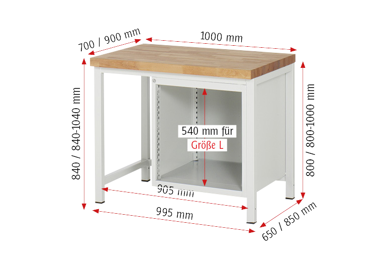 - 4-Fuß Schweißgestell mit zwei Gestellfußpaaren aus Profil-Stahlrohr (45x45x2 mm) inkl. Tiefenverstrebungen (oben und unten). Gestellfüße unten mit Abschlusselement inkl. Anti-Rutsch-Noppe für sicheren Stand. Querstreben aus C-Profil (40x40x2 mm) oben unter der Arbeitsplatte (vorne, hinten) sowie unten (hinten). Die Gestellfüße sind vorbereitet für die Aufnahme/Nachrüstung einer Höhenverstellung und/oder eines Rollensatzes.